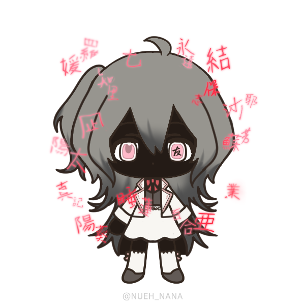 오른쪽 눈은 여전히 흰 테두리에 분홍색 동공이지만 왼쪽 눈에는 흰테두리에 분홍색 동공, 그 안에 ‘友’라는 글씨가 있으며 허공에 붉은 분홍색으로 빛나는 친구들의 이름의 허상이 떠다닌다.